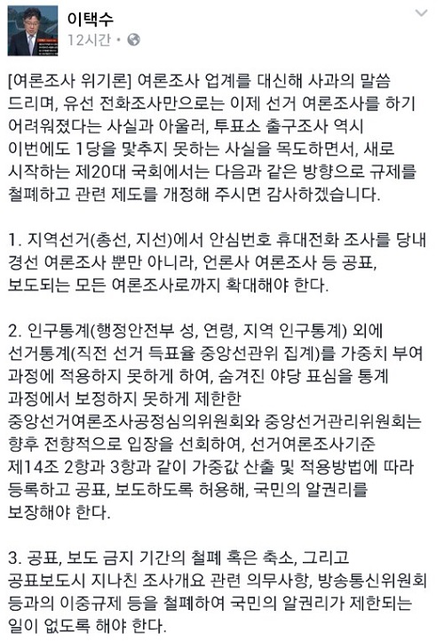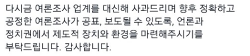 이를 토대로 총선 직후 ‘여론조사 위기론’이 거론되자, <리얼미터> 이택수 대표는 자신의 페이스북을 통해 “유선 전화조사만으로는 이제 선거 여론조사를 하기 어려워졌다는 사실”을 인정하며 “투표소 출구조사 역시 이번에도 1당을 맞추지 못하는 사실을 목도했다”고 밝혔다.