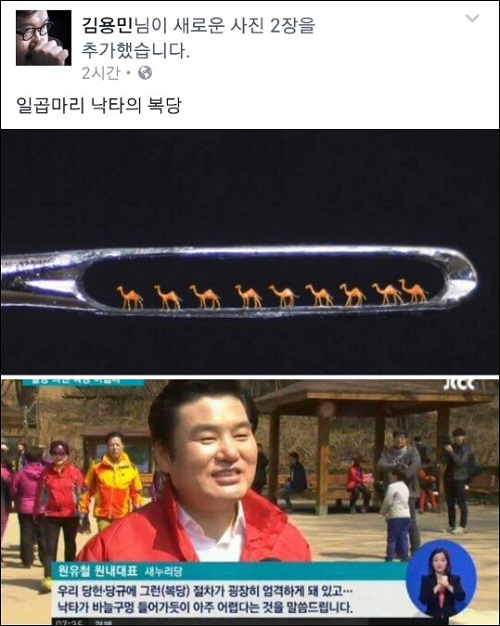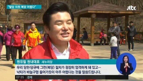 방송인 김용민 씨는 “우리 당헌‧당규에 그런(복당)절차가 굉장히 엄격하게 돼 있고.. 낙타가 바늘구멍 들어가듯이 아주 어렵다는 것을 말씀 드린다”는 내용의 과거 원유철 원내대표의 <JTBC>와의 인터뷰 내용을 상기시키며 “일곱마리 낙타의 복당”이라고 힐난했다.