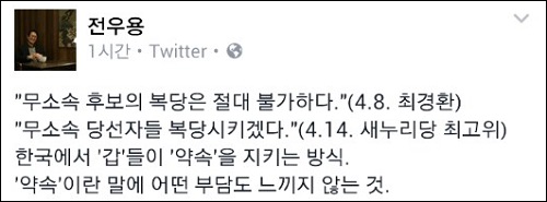 한편, 새누리당의 이 같은 입장에 역사학자 전우용 씨는 “한국에서 ‘갑’들이 ‘약속’을 지키는 방식. ‘약속’이란 말에 어떤 부담도 느끼지 않는 것”이라고 비판했다.