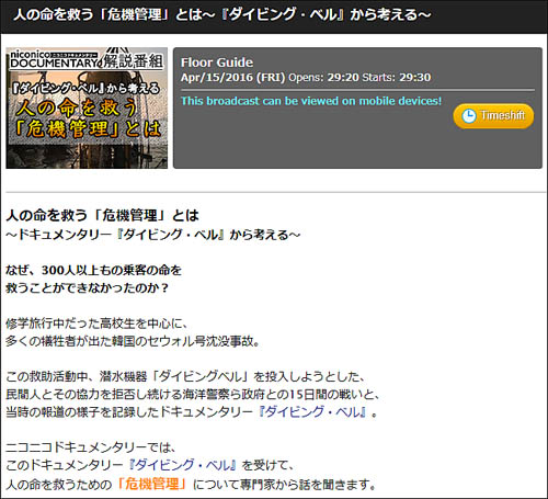 세월호 2주기를 맞아 일본의 대표적 동영상 플랫홈인 니코니코가 세월호 참사를 다룬 다이빙벨을 전격 개봉한다.