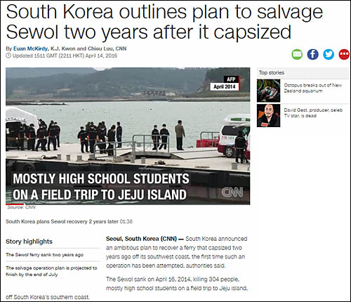 이 소식은 뉴스전문채널인 CNN을 통해 서울발로 보도됐다. 1년전 박근혜 대통령이 “드디어 세월호 인양을 진지하게 준비할 때”라고 선언한지 정확히 1년이 지난 시점이다.