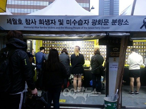 광장 한편에 마련된 분향소에는 1만 여명의 시민이 다녀갔다. 시민들은 광화문 분향소에 꽃을 놓기 위해 이순신 동상을 넘어 해치마당 앞 까지, 4중으로 줄을 서 기다리기도 했다.