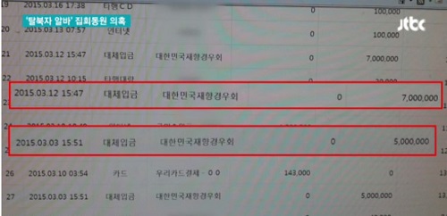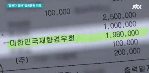 <시사저널>은 탈북난민인권연합의 계좌내역을 입수, 재향경우회가 2014년 12월30일 해당단체에 500만원을 입금했다고 18일 보도했다. 탈북난민인권연합 김용화 회장은 “재향경우회가 입금한 이 돈은 12월에 열린 집회 참가자에게 지급된 알바비”라고 밝혔다.