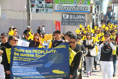 캐나다 토론토 시내가 세월호 참사 2주년을 맞아 희생자들을 추모하는 노란물결로 뒤덮혔다.