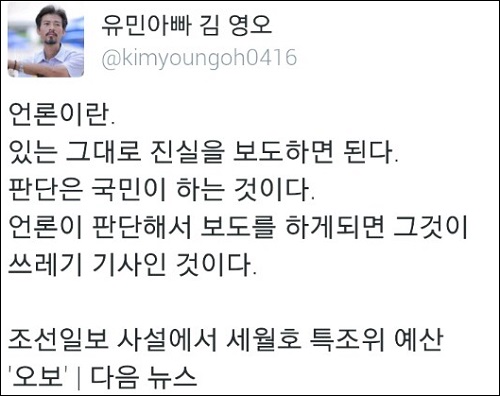 세월호 유가족 ‘유민아빠’ 김영오 씨는 “언론이란 있는 그대로 진실을 보도하면 된다. 판단은 국민이 하는 것”이라며 “언론이 판단해서 보도를 하게 되면 그것이 쓰레기 기사인 것”이라고 일갈했다.
