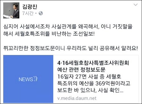 한편, <조선>의 이 같은 오보에 더불어민주당 김광진 의원은 “심지어 사설에서조차 사실관계를 왜곡해서, 아니 거짓말을 해서 세월호 특조위를 비난하는 조선일보!”라며 “쥐꼬리 만한 정정보도문이니 우리라도 널리 공유해서 알려요!”라며 자신의 페이스북에 <조선>의 정정 보도문을 공유했다.