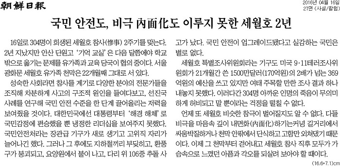 <조선>은 “국민 안전도, 비극 內面化도 이루지 못한 세월호 2년”이란 제목의 16일자 사설에서 미국 9‧11테러조사위원회와 세월호 특조위의 예산을 비교 언급했다.