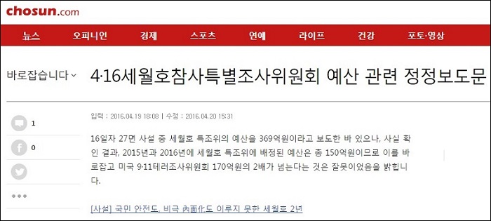 <조선>은 이에 앞서 19일 조선닷컴을 통해 정정보도문을 게재 “사실 확인 결과, 2015년과 2016년에 세월호 특조위에 배정된 예산은 총 150억원이므로 이를 바로 잡고 미국 9‧11테러조사위원회 170억원의 2배가 넘는다는 것은 잘못이었음을 밝힌다”고 전했다.