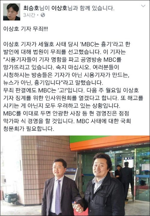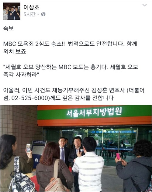 이날 판결 직후 이상호 기자는 자신의 SNS를 통해 무죄 소식을 전하며 “(이젠) 법적으로도 안전하다. 함께 외쳐 보자”며 “세월호 오보 양산하는 MBC 보도는 흉기다. 세월호 오보 즉각 사과하라”고 말했다.
