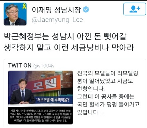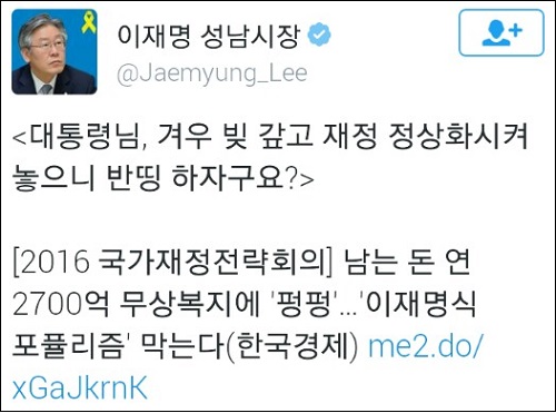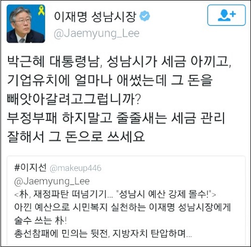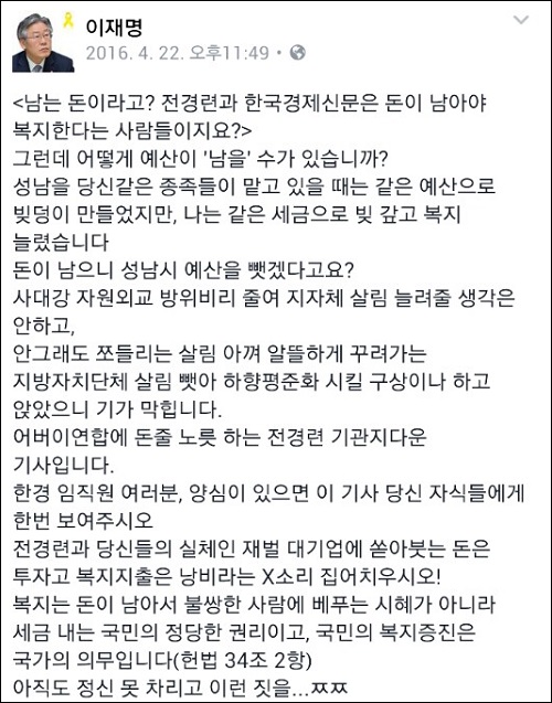 “돈이 남는다”는 <한경>의 보도에 대해서도 이 시장은 “어버이연합에 돈줄 노릇하는 전경련 기관지다운 기사”라며 “전경련과 당신들의 실체인 재벌 대기업에 쏟아 붓는 돈은 투자고 복지지출은 낭비라는 X소리는 집어치우라”고 질타했다.