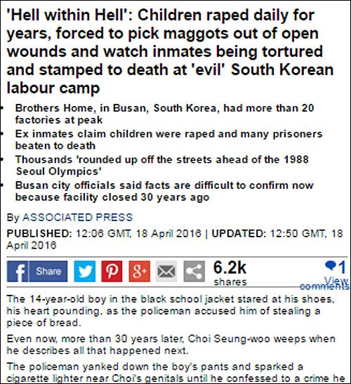 단독으로 입수한 수백 건의 문서들, 그리고 수용시설 관계자 및 전 수감자들과의 수십 차례 인터뷰에 근거한 AP통신의 조사는, 이와 비슷한 수십 개의 수용시설 중 최대 규모인 형제복지원에서 소위 부랑자에 대한 학대는 이전에 알려진 것보다 훨씬 더 잔학하고 광범위했다는 것을 보여준다.