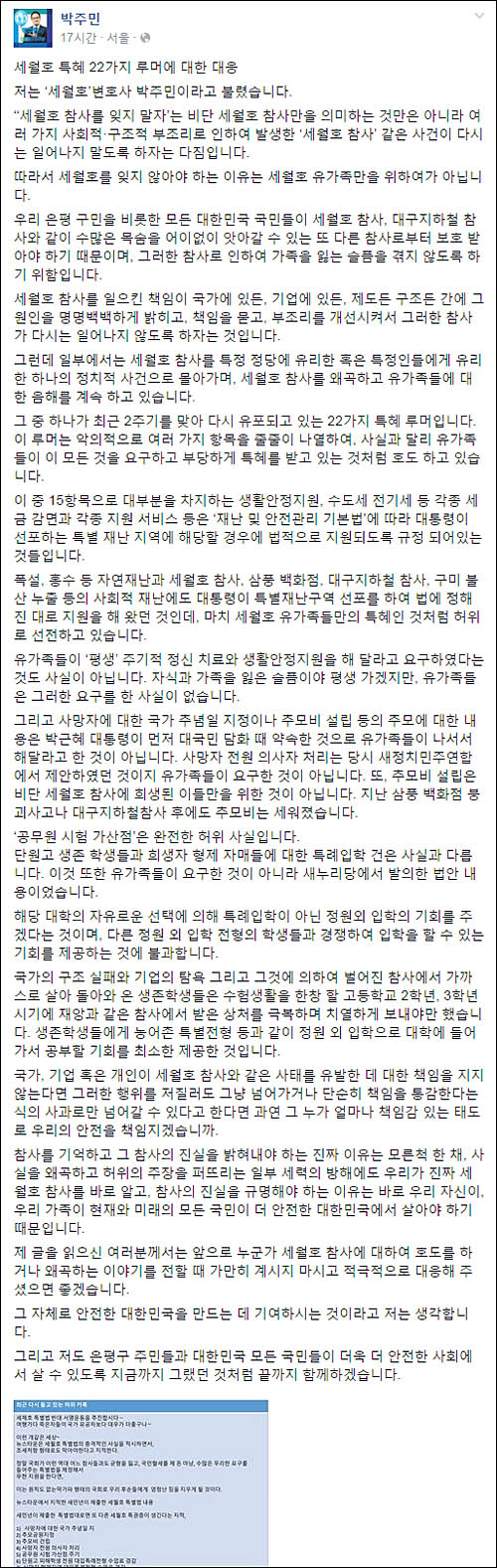 박주민 더불어민주당 당선자가 “세월호 참사 2주기를 맞아 22가지 특혜 루머가 다시 유포되고 있다”며 “가만히 계시지 말고 적극 대응해달라”고 당부했다.
