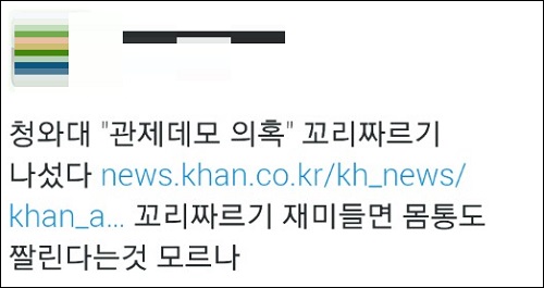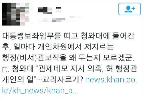한편, <경향신문>은 “윗선 보고 가능성·전경련 영향력…허 행정관 ‘단독 행동’ 의문”이란 제목의 25일자 기사에서 “추 사무총장과 집회를 논의한 것이 허 행정관의 ‘단독 행동’이었는지 의문”이라며 “청와대 선임행정관은 매일 보고서를 만들어 ‘윗선’에 제출하고 수시로 비서관 등과 상의한다”고 설명했다.