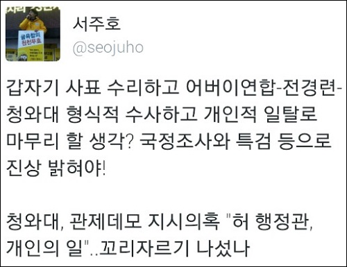 서주호 정의당 사무처장도 “갑자기 사표 수리하고 어버이연합-전경련-청와대 형식적 수사하고 개인적 일탈로 마무리 할 생각?”이냐며 “국정조사와 특검 등으로 진상 밝혀야”한다고 촉구했다.