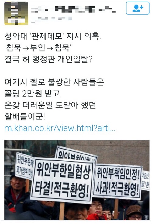‘한일 위안부 합의 지지 집회’와 관련, 어버이연합과 청와대가 “협의했다”는 증언까지 나왔지만 청와대는 이를 부인, 허현준 행정관의 개인일탈로 치부해 꼬리자르기 하려는 것 아니냐는 의심을 사고 있다.