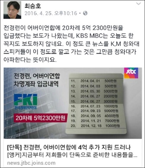 MBC해직언론인 최승호 PD(현 뉴스타파)는 25일 자신의 SNS를 통해 “전경련이 어버이연합에 20차례 5억 2300만원을 입금했다는 보도가 나왔는데 KBS, MBC는 오늘도 한 꼭지도 보도하지 않네요”라며 “이 정도 큰 뉴스를 K,M 청와대 스피커들이 이 정도로 깔고 가는 것은 그만큼 청와대가 아파한다는 뜻”이라고 꼬집었다.