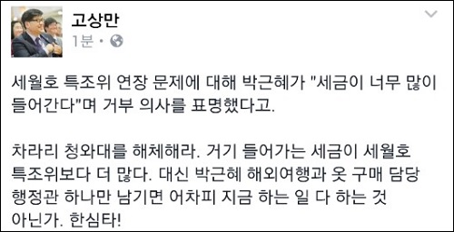 그는 이어 “대신 박근혜 해외여행과 옷 구매 담당 행정관 하나만 남기면 어차피 지금 하는 일 다 하는 것 아닌가. 한심타!”라고 일갈했다.