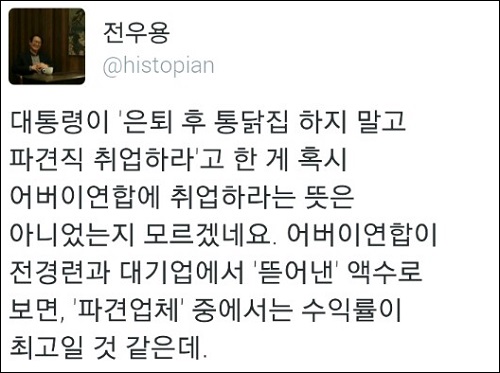 그러면서 “대통령이 ‘은퇴 후 통닭집 하지 말고 파견직 취업하라’고 한 게 혹시 어버이연합에 취업하라는 뜻은 아니었는지 모르겠다”며 “어버이연합이 전경련과 대기업에서 ‘뜯어낸’ 액수로 보면, ‘파견업체’ 중에서는 수익률이 최고일 것 같다”고 덧붙였다.