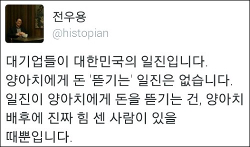그는 이어 “대기업들이 대한민국의 일진이다. 양아치에게 돈 ‘뜯기는’ 일진은 없다”며 “일진이 양아치에게 돈을 뜯기는 건, 양아치 배후에 진짜 힘 센 사람이 있을 때 뿐”이라며 이같이 강조했다.