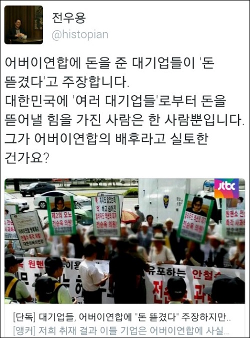 한편, 해당 보도를 접한 역사학자 전우용 씨는 자신의 트위터를 통해 “어버이연합에 돈을 준 대기업들이 ‘돈을 뜯겼다’고 주장한다”며 “대한민국에 ‘여러 대기업들’로부터 돈을 뜯어낼 힘을 가진 사람은 한 사람 뿐이다. 그가 어버이연합의 배후라고 실토한 건가요?”라고 의문을 제기했다.