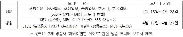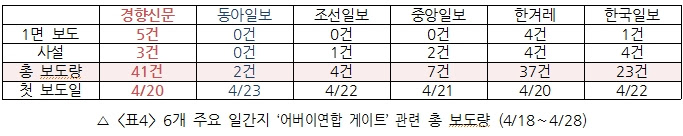 신문 보도량(<표4> 참조)에서도 격차는 극명했다. 경향신문이 41건, 한겨레가 37건으로 많은 양을 보도한 데 비해서, 동아일보는 모니터 기간 동안 총 2건, 조선일보는 4건의 보도만을 내놨다. 중앙일보 역시 7건에 그쳤다.