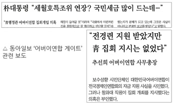 관련 보도를 가장 적게, 가장 늦게 내놓은 동아일보는 그나마 내놓은 보도 역시 제대로 된 의혹을 제기한 것이 없었다. 첫 관련 보도인 <“전경련 지원 받았지만 靑 집회 지시는 없었다”>(4/23, 10면,http://me2.do/x0f5I9i6)는 22일 열린 추선희 어버이연합 사무총장의 청와대 직원이 집회 개최를 지시했다는 의혹을 부인하는 기자회견 내용을 그대로 소개하고 있을 뿐이다. <朴대통령 “세월호특조위 연장? 국민세금 많이 드는데…”>(4/27, 5면, http://me2.do/54cdaR4O)에서는 박근혜 대통령이 26일 언론사 편집·보도국장 초청 간담회에서 어버이연합의 활동에 관해 “(시민단체들이) 다 자신들의 가치와 추구하는 바가 있기 때문에 다양한 활동을 하는 단체들에 대해 이것은 좋고 저것은 나쁘다고 대통령이 공개적으로 얘기하는 것은 바람직하지 않다”고 발언한 것을 역시 별다른 부연 설명도 없이 그대로 소개했다.
