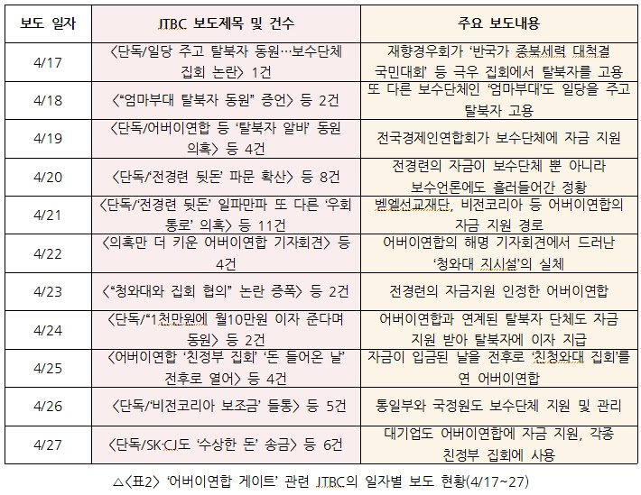 방송 보도량(<표3>참조)부터 살펴보면, KBS는 11일간 단신 단 1건을 보도했고 MBC도 1건으로 사실상 사안을 ‘은폐’했다. 각 3건을 보도한 SBS과 MBN 2건을 보도한 채널A도 소극적이고 사태의 본질을 제대로 전하지 못했다. TV조선은 JTBC를 제외한 6개사 중 가장 많은 11건을 보도 했지만, 청와대를 감싸는 등 ‘물타기’ 의도가 엿보이기도 했다.