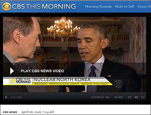오바마 미국 대통령은 지난달 26일 미국 CBS방송에 출연해 북한 핵과 미사일이 세계 평화를 위협한다면서 압도적 군사력으로 북한을 괴멸시킬 수 있지만 지리적으로 인접한 한국, 또 예상되는 엄청난 인명피해 등을 고려해 군사적 대응을 고려치 않는다고 말했다.