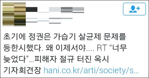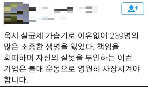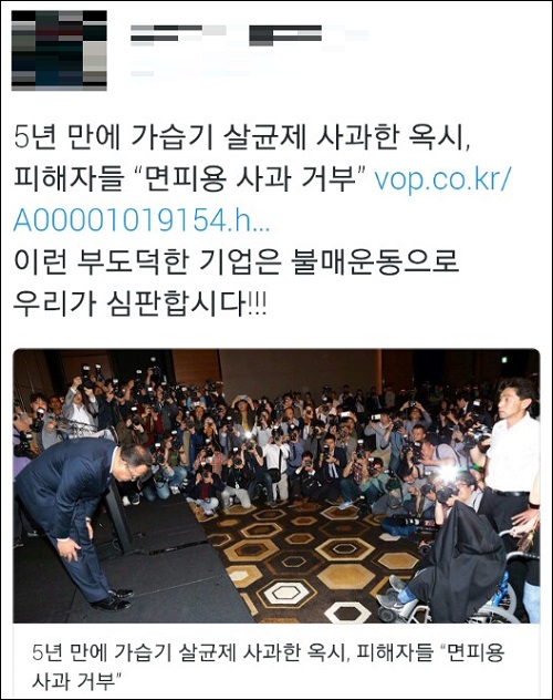 옥시가 5년 만에 뒤늦게 공식 사과에 나섰지만 소비자들의 분노는 수그러들지 않고 있다. SNS상에서는 옥시 불매운동을 독려하는 목소리뿐 아니라 ‘국가 책임론’을 거론하며 정부를 비판하는 목소리도 높다.