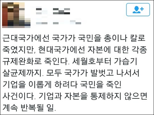 “세월호부터 가습기 살균제까지.. 국가가 기업 이롭게 하려다 국민 죽인 사건”
