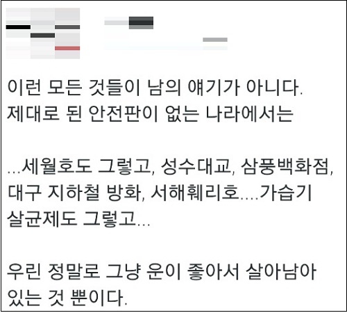 정철승 변호사(법무법인 더펌)도 자신의 페이스북을 통해 “세월호 참사에도 불구하고 정권이 쫓겨나지 않고, 가습기 세정제 참사에도 불구하고 제조사가 망하지 않는다면 제대로 돈 국가가 아니라고 생각한다”고 일갈했다.