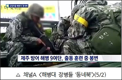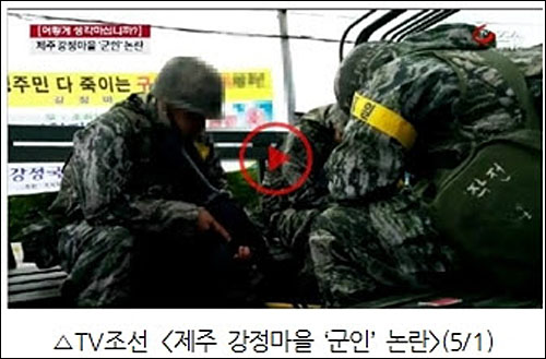 TV조선 <어떻게 생각하십니까/제주 강정마을 ‘군인’ 논란>(5/1, 13번째, 서주민 기자,http://me2.do/F2G9hoL5) 채널A <해병대 장병들 ‘동네북’>(5/2, 9번째, 김성진 기자,http://me2.do/5rHNapEU)