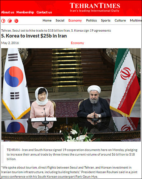 테헤란 타임스는 2일 ‘Tehran, Seoul set to hike trade to $18 billion/Iran, S. Korea sign 19 agreements-이란, 한국 180억 달러 규모로 무역 늘리기로/19개 협정 서명, S. Korea to invest $25b in Iran-한국 정부, 이란에 250억 달러 투자하기로’라는 제목의 기사를 통해 ‘“이란 이슬람공화국과의 관계를 지원하기 위해 한국은 이란의 사회간접시설 계획을 위한 재정에 250억 달러를 제공할 것이다. 이것은 이제까지 한국이 다른 국가에 제공한 가장 큰 규모의 금융 패키지이다”라고 박근혜는 강조했다.’고 한국의 투자내용을 전했다.