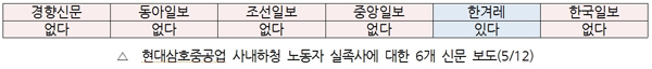 11일 현대중공업의 계열사인 현대삼호중공업 사내 하청업체 노동자가 추락해 숨졌다. 이를 지면에 보도한 것은 6개 일간지 중 한겨레가 유일하다.