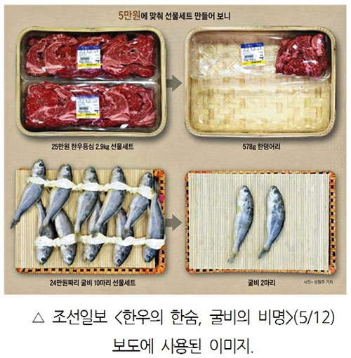 조선일보는 ‘부정청탁 및 금품 등 수수의 금지에 관한 법률’, 일명 김영란법이 ‘내수를 위축시켜 경제를 망칠 것’이라는 주장을 펼치고 나섰다. 이 같은 주장을 펼치는 과정에서 조선일보는 5만원에 맞춰 만든 ‘허접한’ 굴비와 한우 선물세트 이미지를 제시하거나, “김영란법으로 더 먹고살기 어려워졌소”라는 굴비 가게 운영자의 한탄과 “3년 전보다 벌이가 절반으로 줄어들었는데, 이제는 아예 난 산업 자체를 없애려고 한다”는 난(蘭) 판매자의 푸념을 소개했다. “김영란법이 시행되면 가장 큰 수혜자는 ‘중국산 식자재’가 될 것”이라는 ‘협박’도 등장했다. 그러나 기사 내에는 현업 종사자들의 ‘불안감’을 넘어서는 근거가 제대로 제시되고 있지 않다. 실제 김영란법 시행으로 내수는 위축되는 것일까?