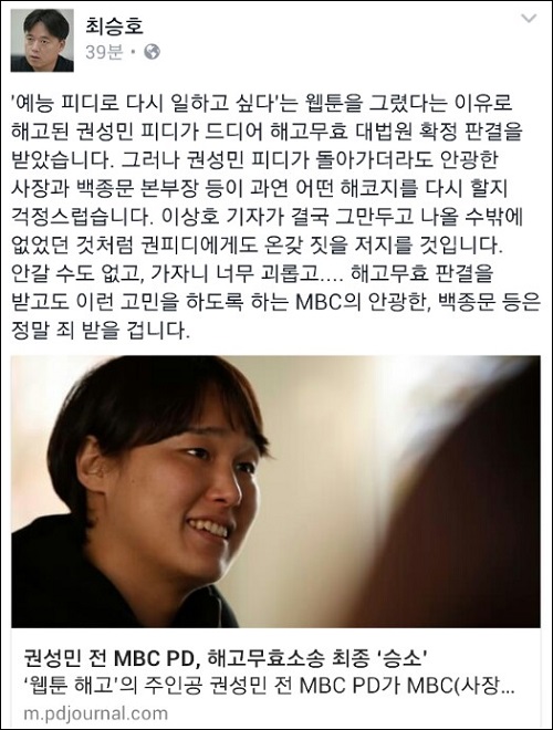 회사를 비판하는 ‘웹툰’을 그렸다는 이유로 해고된 권성민 MBC 예능PD가 사측을 상대로 낸 해고무효소송에서 최종 승소했다.