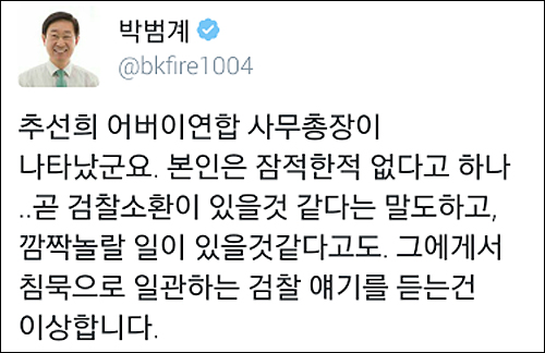 박 의원은 “곧 검찰소환이 있을 것 같다는 말도 하고, 깜짝 놀랄 일이 있을 것 같다고도”라고 지적하고 “그에게서 침묵으로 일관하는 검찰 얘기를 듣는 건 이상하다”고 말했다.