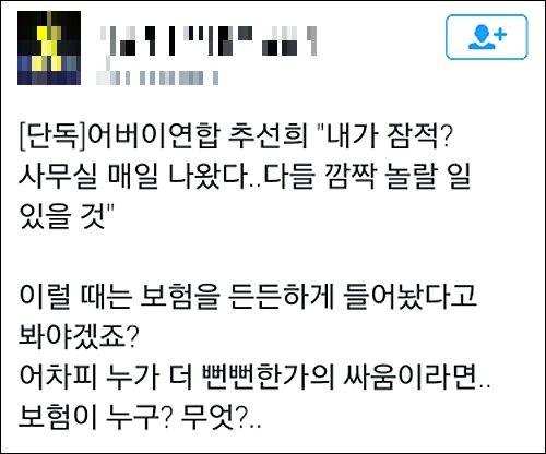 SNS에서는 “이제 시나리오가 만들어졌으니 입을 여나보네”, “추선희가 깜짝 놀랄 일이 있다 하네요, 무슨 권력 기관과 입 맞춰서 무슨 수작 부렸나봐요”, “말 다 맞췄군”, “준비 끝났나봄. 자신만만하게 등장했네”, “제발 깜짝 놀라게 해주세요”, “이럴 때는 보험을 든든하게 들어놨다고 봐야겠죠? 어차피 누가 더 뻔뻔한가의 싸움이라면..”, “검찰은 어버이연합 게이트 조사 안하냐?” 등의 의견들이 올라왔다.