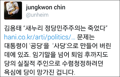 새누리당 상황에 대해 진중권 동양대 교수는 트위터에서 “문제는 대통령이 ‘공당’을 ‘사당’으로 만들어 버린 데에 있다”며 “임기말을 넘어 퇴임 후까지도 당의 실질적 주인으로 수렴청정 하려던 욕심에 당이 망가진 것”이라고 일갈했다.