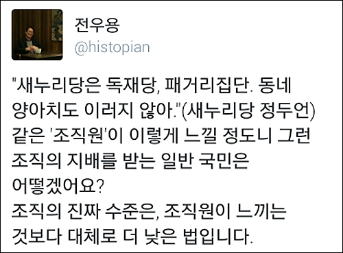 전우용 역사학자는 정두언 의원의 “새누리당은 독재당, 패거리집단, 동네 양아치도 이러지 않아”란 발언을 지적하며 “같은 ‘조직원’이 이렇게 느낄 정도니 그런 조직의 지배를 받는 일반 국민은 어떻겠냐”고 반문했다. 전 학자는 “조직의 진짜 수준은, 조직원이 느끼는 것보다 대체로 더 낮은 법”이라고 꼬집었다.