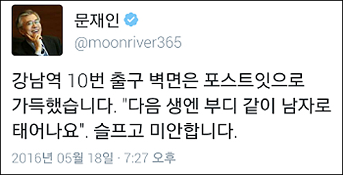 보좌진 없이 강남역 추모 현장을 방문한 문재인 더불어민주당 전 대표는 18일 트위터에 “강남역 10번 출구 벽면은 포스트잇으로 가득했습니다”라고 글을 남기기도 했다.
