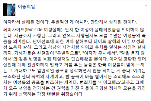 이송희일 영화감독은 “여자라서 살해된 것이다. 우발적인 게 아니라, 만만해서 살해된 것”이라고 규정했다.
