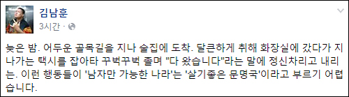 김남훈씨는 19일 새벽에 다시 글을 올려 “늦은 밤. 어두운 골목길을 지나 술집에 도착. 달큰하게 취해 화장실에 갔다가 지나가는 택시를 잡아타 꾸벅꾸벅 졸며 “다 왔습니다”라는 말에 정신차리고 내리는. 이런 행동들이 ‘남자만 가능한 나라’는 ‘살기좋은 문명국’이라고 부르기 어렵다”고 비판했다.