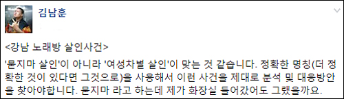 김남훈씨는 18일 페이스북에서 “‘묻지마 살인’이 아니라 ‘여성차별 살인’이 맞는 것 같다”면서 이같이 말했다.