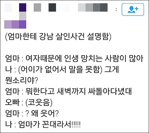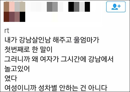 실제 이번 사건과 관련 SNS에서는 “강남 살인남 얘기를 해주니 우리 엄마가 첫번째로 한 말이 ‘그러니까 왜 여자가 그 시간에 강남에서 놀고 있어’였다, 여성이니까 성차별 안하는 건 아니다”(@1stm******) 등의 글이 올라왔다.