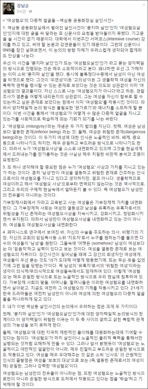 강 교수는 이날 페이스북에서 “이번 사건을 통해서 ‘여성혐오’가 어떻게 수많은 다층적 얼굴을 지니고 있는가를 사회적으로 학습하게 되는 기회가 되기 바란다”며 이같이 설명했다.