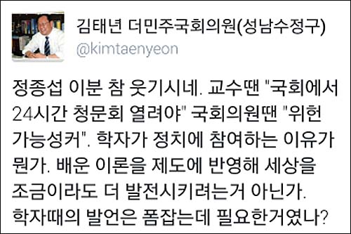 김태년 더민주 의원은 “학자가 정치에 참여하는 이유가 뭔가. 배운 이론을 제도에 반영해 세상을 조금이라도 더 발전시키려는 거 아닌가”라며 “학자 때의 발언은 폼 잡는데 필요한 거였나?”라고 꼬집었다.