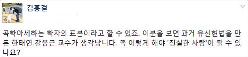 김 위원장은 “곡학아세하는 학자의 표본”이라며 정 당선인(대구 동갑)이 박근혜 대통령의 거부권 행사에 힘을 실어주기 위해 학문적 소신을 버린 것을 비판했다.