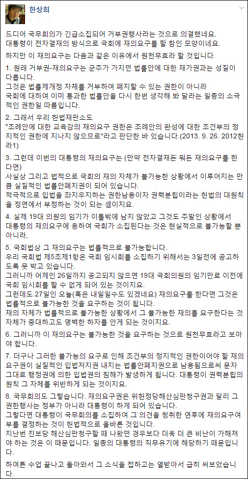 한 교수는 이날 페이스북에서 “법률적으로 불가능한 상황에서 불가능한 재의를 요구한다는 것 자체가 중대하고도 명백한 하자를 안게 되는 것”이라면서 이같이 주장했다.