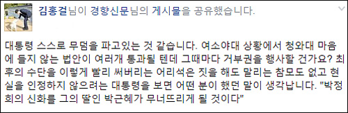 이어 김 위원장은 “최후의 수단을 이렇게 빨리 써버리는 어리석은 짓을 해도 말리는 참모도 없고 현실을 인정하지 않으려는 대통령을 보면 어떤 분이 했던 말이 생각난다”며 “박정희의 신화를 그의 딸인 박근혜가 무너뜨리게 될 것이다”라고 인용해 비판했다.